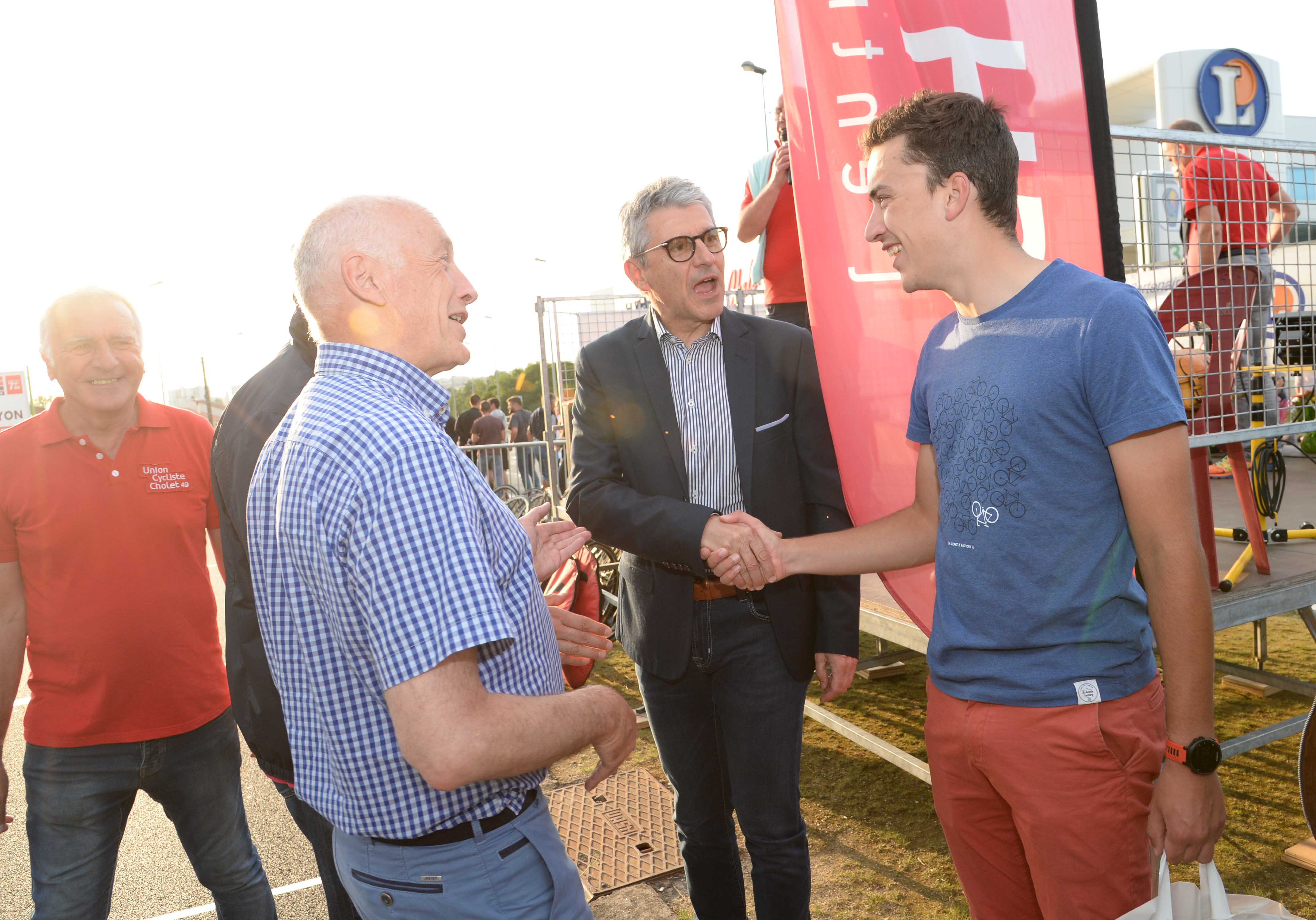 🚴Toujours un grand plaisir de donner le départ des 2 courses Prix Leclerc de Lune à l’invitation de l’UCC49. Avec F. Dabin, Patrice Brault et J. Joutean.